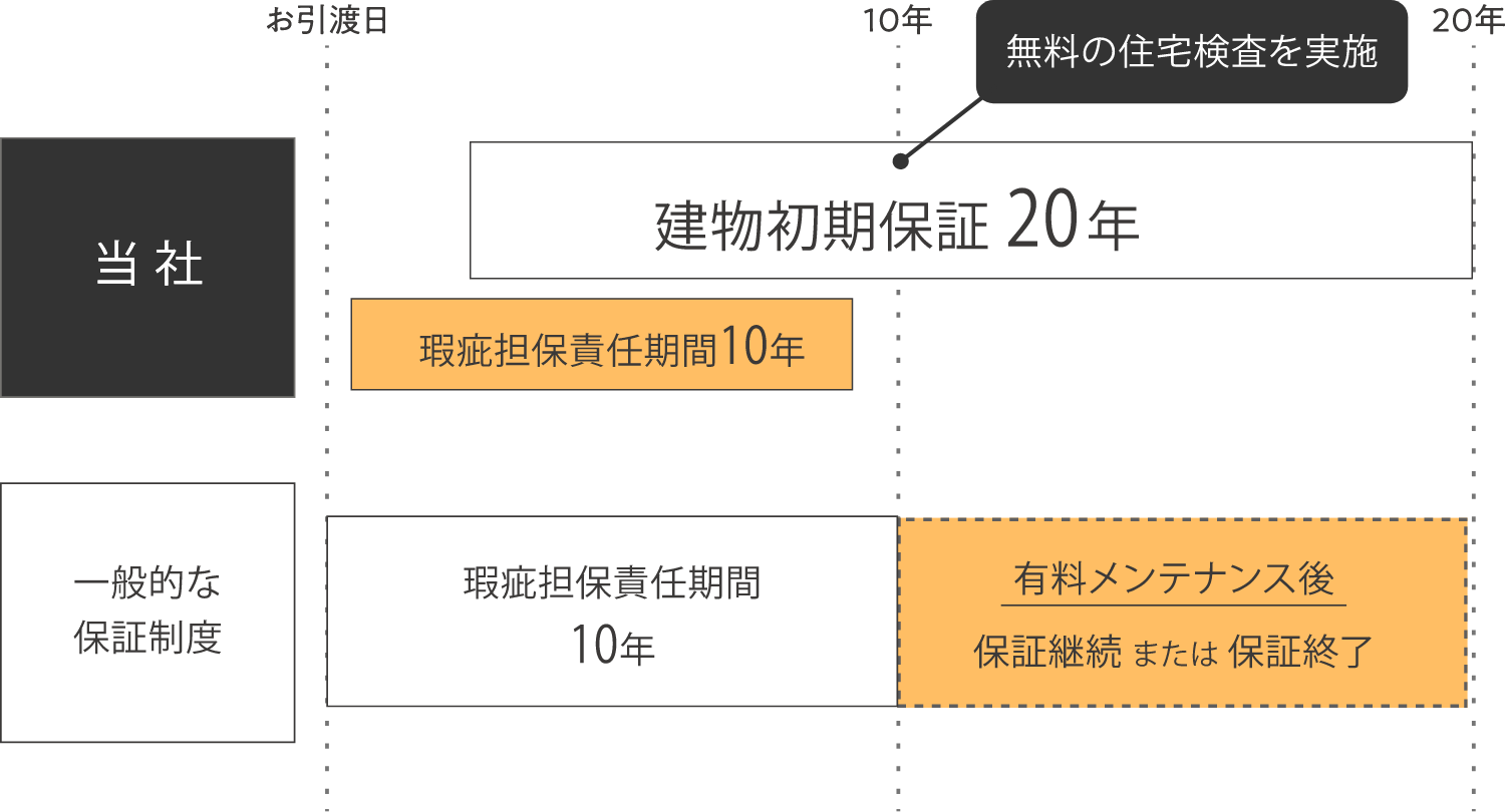 建物の重要な構造・雨水の侵入に関する瑕疵(不具合)において、法律で定められている10年を超えて20年間保証します。ご希望の場合、最長で60年保証となる有料サービスも受けられます。