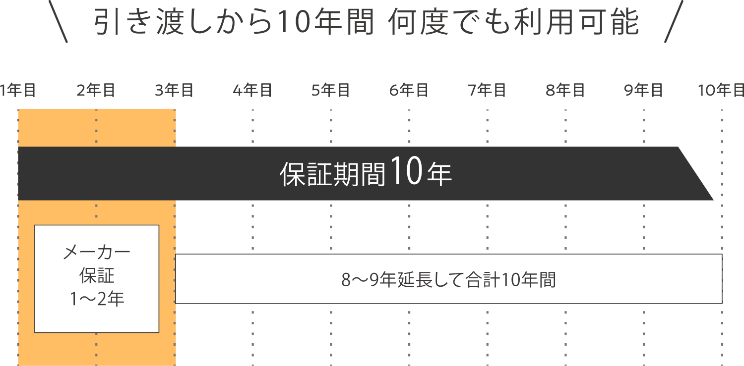 給湯器やトイレなどの住宅設備機器について、メーカー保証が過ぎてから故障や不具合が発生しても10年間無料で修理や交換を受けられます。引き渡しから10年間何度でも利用可能です。機器ごとに異なるメーカーでも窓口は一本化されるので便利です。